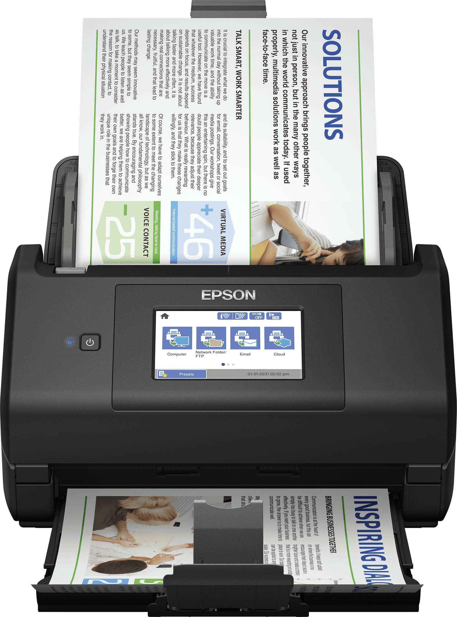 • Wireless scanning Scan direct to cloud, network folders and email without a PC • Intuitive Epson ScanSmart software for the PC and Mac Previewing, OCR and uploading made easy • Efficient Scan up to 35 ppm / 70 ipm1, capturing both sides in one pass • Intelligent Auto crop, skew correction, blank page and background removal • Control panel Easy to use 10.9cm colour LCD touchscreen